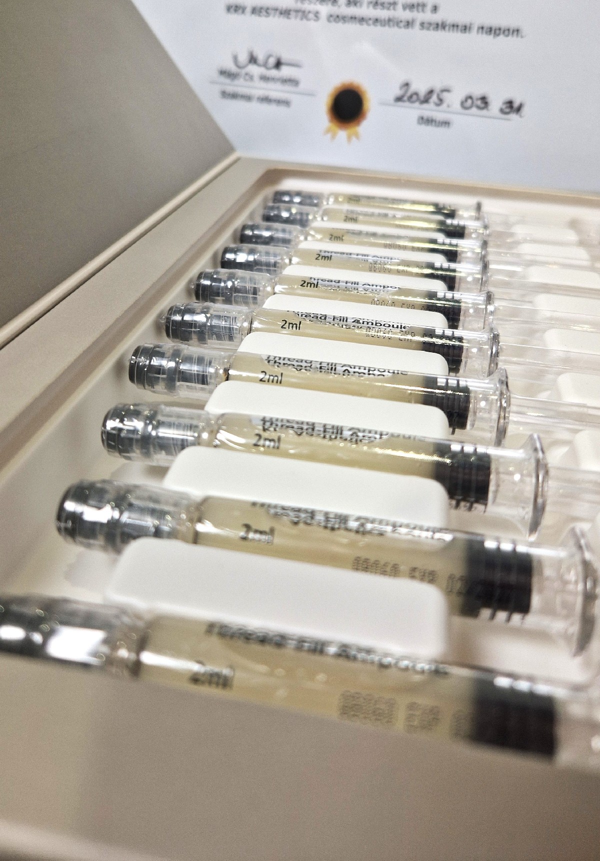 Thread-fill precíziós ampullái a bőr különböző rétegeibe szívódnak fel, így a hatása időben eltérő. Az azonnali lifting hatás mellett folyamatosan stimulálja a bőrt, így hosszabban tartó eredményt biztosít. Ez a szál önmagában is tele van aktív hatóanyagokkal, erősíti a bőrt, hidratálja és fokozza annak rugalmasságát. Ázsiai összetevői egy intenzív nyugtató hatást biztosítanak. Amennyiben a kezeléseket kombináljuk más hatóanyagokkal vagy gépi kezelésekkel az eredmények is fokozódnak.